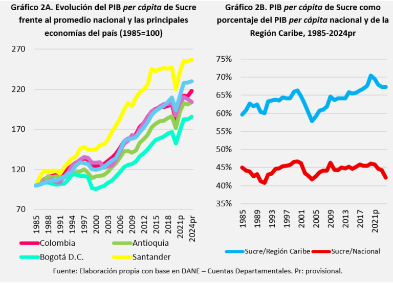 2. ¿Qué tan bien viven los sucreños frente a los habitantes de la región y el país? Los sucreños (Gráfico 2A, línea morada) han experimentado una mejora en su nivel de vida en términos absolutos, evidenciada en el crecimiento del PIB per cápita departamental. En 40 años, este aumentó 2,2 veces. No obstante, esta expansión resulta limitada frente al avance de los promedios nacional y de la Región Caribe. El Gráfico 2A muestra la evolución del PIB per cápita de Sucre en comparación con el PIB per cápita nacional y el de las economías más prósperas del país durante el período 1985–2024. El análisis se presenta en términos de índice, estableciendo 1985 como año base = 100, lo que permite evaluar el crecimiento relativo de cada economía con respecto a ese año inicial.