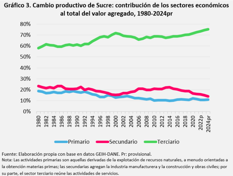 Por su parte, el sector secundario (suma de la industria y la construcción), registró una pérdida de 10 puntos porcentuales en su contribución al valor agregado departamental. Las mejoras en su participación fueron coyunturales (años 1990 y entre 2006-2014), las cuales se asociaron al dinamismo de la construcción, un fenómeno observado en el país tras la bonanza petrolera y carbonífera. Sin embargo, la limitada demanda interna, la baja inversión en infraestructura y el reducido capital humano frenaron el desarrollo industrial. Paralelamente, el sector terciario creció hasta concentrar más del 70 % del PIB sucreño en la actualidad. Pero, este auge no implica modernización productiva; autores como Bonet (2007) describen este cambio del perfil productivo como una terciarización espuria, que se caracteriza por el predominio de actividades de servicios de baja productividad, alta informalidad y escaso aporte a la competitividad, asentadas en el comercio y transporte (ver siguiente sección).