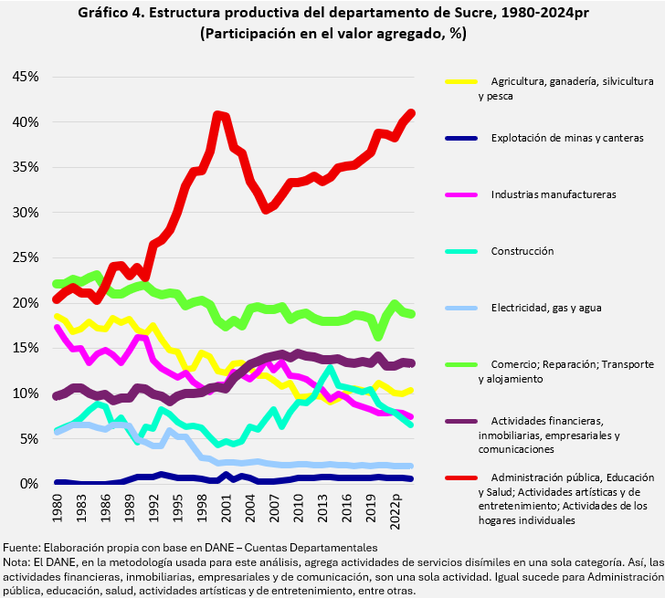 Sucre ha experimentado una transformación gradual en su estructura económica, pasando de una fuerte dependencia de la agricultura y la ganadería a una mayor participación del sector terciario (servicios). A inicios de los 2000, Aguilera (2005) señalaba que la economía sucreña se fundamentaba en actividades agropecuarias; dos décadas después, esa descripción sigue siendo válida, aunque con un peso mucho menor en el PIB departamental. Entre 1980 y 2024, la contribución agropecuaria pasó de estar cerca del 60 % a alrededor del 30 %, reflejando la pérdida de centralidad de la agricultura y la ganadería en la dinámica productiva regional.
